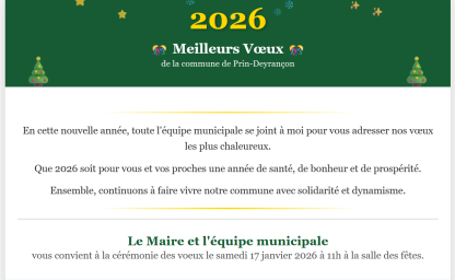 Le Maire et l’équipe municipale vous convient à la cérémonie des vœux le samedi 17 janvier 2026 à 11h à la salle des fêtes.